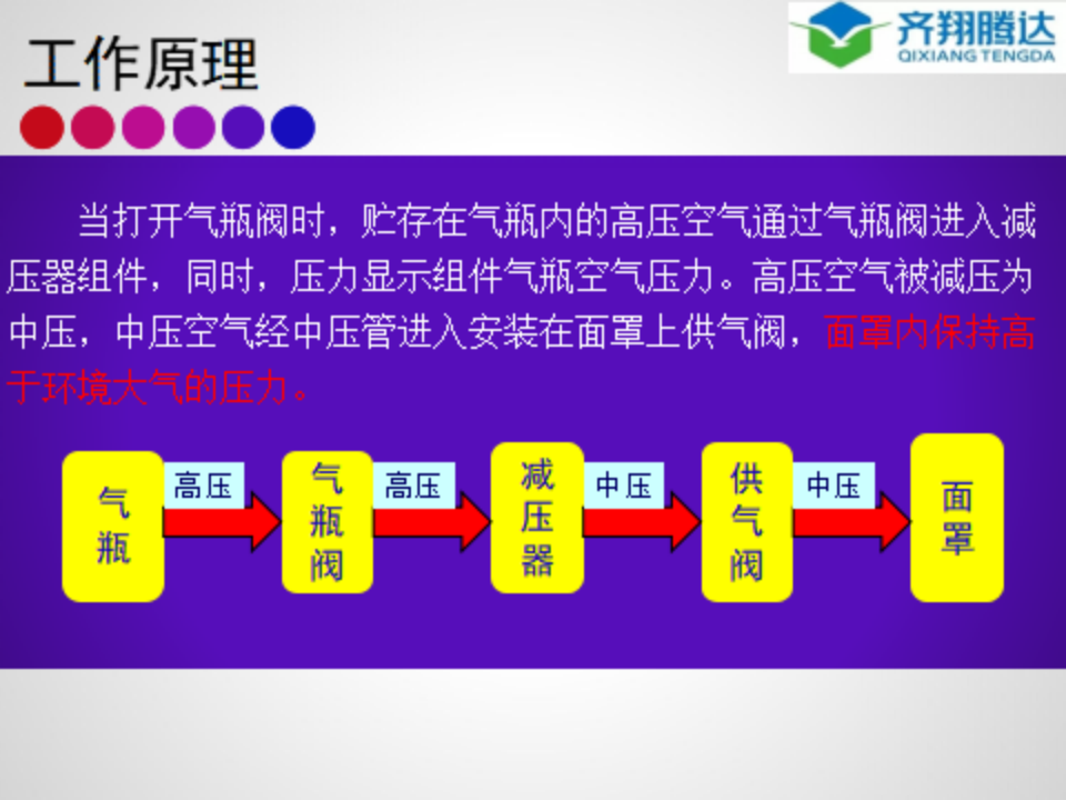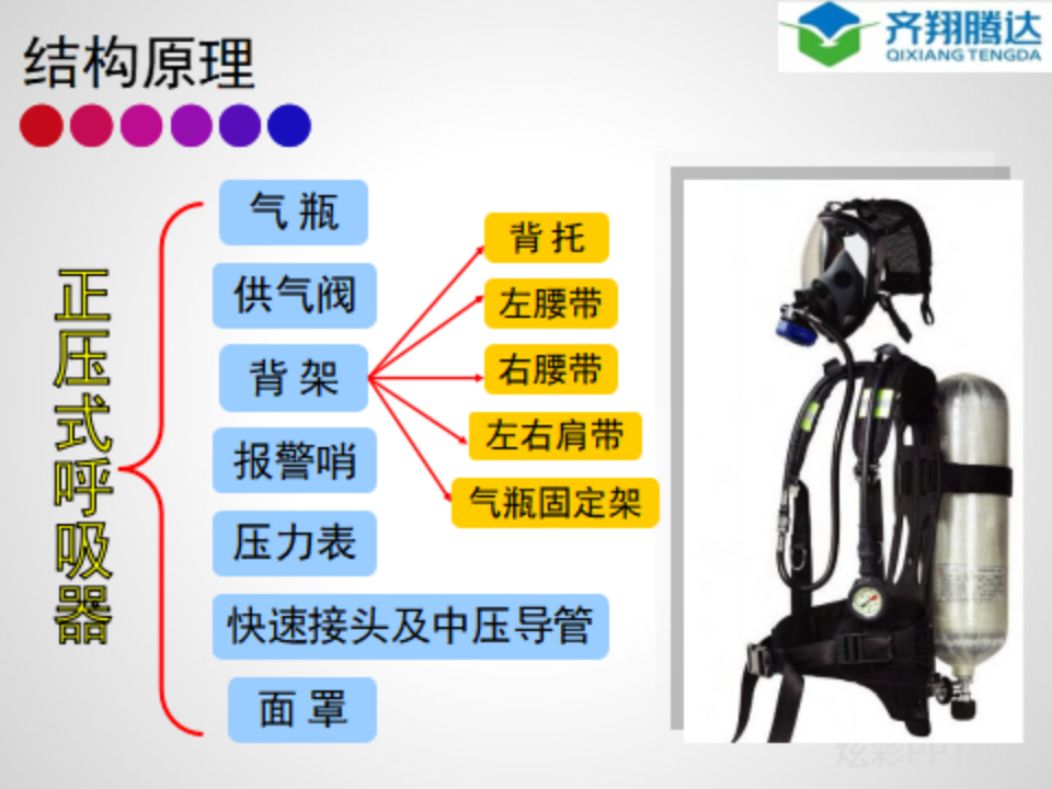 1、空气呼吸器的结构:正压式空气呼吸器主要由气瓶、供气阀、背架、报警哨、压力表、中压导管、快速接头和面罩组成。